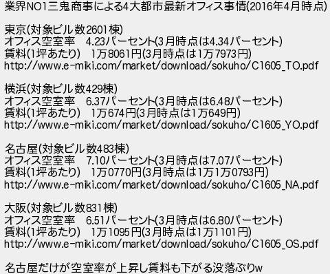 6: [] 2016/06/04(土) 11:02:00.50 ID:I4EqI0ax 業界NO1三鬼商事による4大都市最新オフィス事情(2016年4月時点) 東京(対象ビル数2601棟) オフィス空室率 4.23パーセント(3月時点は4.34パーセント) 賃料(1坪あたり) 1万8061円(3月時点は1万7973円) http://www.e-miki.com/market/download/sokuho/C1605_TO.pdf 横浜(対象ビル数429棟) オフィス空室率 6.37パーセント(3月時点は6.48パーセント) 賃料(1坪あたり) 1万674円(3月時点は1万649円) http://www.e-miki.com/market/download/sokuho/C1605_YO.pdf 名古屋(対象ビル数483棟) オフィス空室率 7.10パーセント(3月時点は7.07パーセント) 賃料(1坪あたり) 1万0770円(3月時点は1万1万0793円) http://www.e-miki.com/market/download/sokuho/C1605_NA.pdf 大阪(対象ビル数831棟) オフィス空室率 6.51パーセント(3月時点は6.80パーセント) 賃料(1坪あたり) 1万1095円(3月時点は1万1101円) http://www.e-miki.com/market/download/sokuho/C1605_OS.pdf 名古屋だけが空室率が上昇し賃料も下がる没落ぶりw http://egg.5ch.io/test/read.cgi/develop/1464996989/6