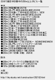 940: (やわらか銀行) [] 2018/03/12(月) 19:47:10.99 ID:vY0D+gNa 日本で建設中計画中の200m以上のビル一覧 東京____________________ ●390m(常盤橋B棟)2027年 ●330m(虎ノ門・麻布台地区A街区)2022年 ●287m(日本橋一丁目中地区)2025年← NEW ●270m(虎ノ門・麻布台地区B1街区)2022年 ●265m(虎ノ門ステーションタワー)2022年 ●250m(八重洲一丁目東地区)2024年 ●245m(八重洲二丁目北地区)2021年 ●240m(虎ノ門・麻布台地区B2街区)2022年 ●240m(八重洲二丁目中地区市)2023年 ●235m(芝浦一丁目建替計画S棟)2023年 ●235m(芝浦一丁目建替計画N棟)2029年 ●235m(西新宿三丁目マンションA棟)2019年着工 ●235m(西新宿三丁目マンションB棟)2019年着工 ●230m(常盤橋A棟)2021年 ●230m(渋谷駅東棟)2019年 ●225m(歌舞伎町一丁目)2022年← NEWNEWNEWNEW ●221m(虎ノ門レジデンシャルタワー)2019年 ●211m(三田三・四丁目地区)2023年 ●208m(竹芝地区開発計画)2020年 ●200m(浜松町A街区A-1棟)2026年 ●200m(OH-1計画 B棟) 2020年 除外 ●208m(ザ・パークハウス西新宿)2017年 ●205m(赤坂インターシティAIR)2017年 ●197m(浜松町A街区A-3棟)2018年 大阪 無し(笑) http://skyskysky.net/construction/202102.html http://egg.5ch.io/test/read.cgi/develop/1464996989/940