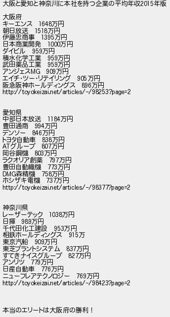 9: [sage] 2016/06/04(土) 14:01:57.60 ID:I4EqI0ax 大阪と愛知と神奈川に本社を持つ企業の平均年収2015年版 大阪府 キーエンス 1648万円 朝日放送 1518万円 伊藤忠商事 1395万円 日本商業開発 1000万円 ダイビル 959万円 積水化学工業 959万円 武田薬品工業 959万円 アンジェスMG 909万円 エイチ・ツー・リテイリング 905万円 阪急阪神ホールディングス 896万円 http://toyokeizai.net/articles/-/98253?page=2 愛知県 中部日本放送 1184万円 豊田通商 994万円 デンソー 846万円 トヨタ自動車 838万円 ATグループ 807万円 岡谷鋼機 803万円 ラクオリア創薬 797万円 豊田自動織機 773万円 DMG森精機 758万円 ホシザキ電機 737万円 http://toyokeizai.net/articles/-/98377?page=2 神奈川県 レーザーテック 1038万円 日揮 989万円 千代田化工建設 953万円 相鉄ホールディングス 915万 東京汽船 909万円 東芝プラントシステム 837万円 すてきナイスグループ 827万円 アンリツ 779万円 日産自動車 776万円 ニューフレアテクノロジー 769万円 http://toyokeizai.net/articles/-/98423?page=2 本当のエリートは大阪府の勝利! http://egg.5ch.io/test/read.cgi/develop/1464996989/9