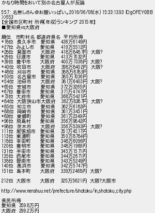 95: [] 2016/06/08(水) 16:33:52.17 ID:USEg3ytx かなり時間をおいて別の名古屋人が反論 557 : 名無しさん@お腹いっぱい。2016/06/08(水) 15:33:13.93 ID:gOFEY0BB >>553 【全国市区町村 所得(年収)ランキング 2015年】 ■愛知県vs大阪府 順位 市町村名 都道府県名 平均所得 *18位 長久手市 愛知県 436万6149円 *27位 みよし市 愛知県 419万5512円 *28位 箕面市 大阪府 418万8487円 大阪? *29位 日進市 愛知県 413万7032円 *39位 豊中市 大阪府 400万7338円 大阪? *40位 吹田市 大阪府 398万8402円 大阪? *48位 刈谷市 愛知県 388万8783円 *50位 名古屋市 愛知県 385万7036円 *54位 池田市 大阪府 381万6403円 大阪? *65位 安城市 愛知県 372万3265円 *67位 豊田市 愛知県 371万4747円 *73位 大府市 愛知県 368万5421円 *84位 大阪狭山市大阪府 362万8387円 大阪? *85位 知立市 愛知県 362万6183円 *88位 岡崎市 愛知県 361万3451円 *89位 東郷町 愛知県 361万2349円 *96位 飛島村 愛知県 356万9842円 *98位 茨木市 大阪府 356万5393円 大阪? 111位 尾張旭市 愛知県 351万4517円 113位 東浦町 愛知県 350万8784円 118位 幸田町 愛知県 348万6096円 120位 豊明市 愛知県 348万1969円 131位 半田市 愛知県 345万1571円 135位 西尾市 愛知県 344万2671円 138位 碧南市 愛知県 343万5249円 140位 高浜市 愛知県 342万5747円 151位 島本町 大阪府 339万2468円 大阪? 212位 大阪市 大阪府 325万5621円 大阪?大阪市 http://www.nenshuu.net/prefecture/shotoku/in_shotoku_city.php 県民所得 愛知県 359.8万円 大阪府 299.2万円 http://egg.5ch.io/test/read.cgi/develop/1465102307/95