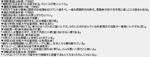 甲陽軍鑑山梨県世紀 関西侍どもはあまりにも弱すぎるそこいらの町人レベル 慶長見聞集神奈川県世紀 武将天下を争ひ関東と関西の合戦聞き伝ひていく度そや一度も西国衆利を得す是関東の侍文武弓馬に達しこころ猛きか故也 雑兵物語東京都世紀 関西侍は馬にも乗れねえっぴりだんべい 近藤勇武州多摩出身の剣豪 京都周辺の剣術は弱すぎる兵は東国に限り候 湯川秀樹京都大学名誉教授東京生まれ 日本では関西が弱くてね東から北へ行くほど強いんですわたしたちの住んでいる京都周辺の兵隊が一番弱いんですね笑 谷崎潤一郎東京都出身の文豪 大阪の人は電車の中で平気で子供に小便糞をさせる人種である 橋下徹大阪市長東京都出身 大阪の人たちは韓国人と非常によく似ている 池田次郎京都大学名誉教授山梨県出身 畿内人は韓国朝鮮人と同じグループに属し日本人から最も離れている バルジーニ横浜市出身の青年実業家 たぶんこのおやじって人は地獄に堕ちると思うよこんな悪い人見たこと無いよ 神聖望埼玉県出身投資家 インチ近パイアのせいで進学先や就職先に影響でるなんてたまったもんじゃないな