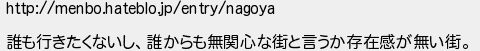 29: [] 2016/09/04(日) 10:42:08.32 ID:OzndzHZt http://menbo.hateblo.jp/entry/nagoya 誰も行きたくないし、誰からも無関心な街と言うか存在感が無い街。 http://egg.5ch.io/test/read.cgi/develop/1472741194/29