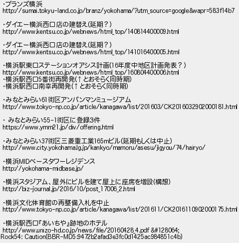9: [sage] 2016/12/01(木) 23:21:17.97 ID:Zl2U7qxm ・ブランズ横浜 http://sumai.tokyu-land.co.jp/branz/yokohama/?utm_source=google&wapr=583f14b7 ・ダイエー横浜西口店の建替え(延期?) http://www.kentsu.co.jp/webnews/html_top/140814400009.html ・ダイエー横浜西口店の建替え(延期?) http://www.kentsu.co.jp/webnews/html_top/141016400005.html ・横浜駅東口ステーションオアシス計画(16年度中地区計画発表?) http://www.kentsu.co.jp/webnews/html_top/160804400006.html ・横浜駅西口5番街再開発(↑とおそらく同時期) ・横浜駅西口南幸再開発(↑とおそらく同時期) ・みなとみらい61街区アンパンマンミュージアム http://www.tokyo-np.co.jp/article/kanagawa/list/201603/CK2016032902000181.html ・ みなとみらい55-1街区に登録3件 https://www.ymm21.jp/div/offering.html ・みなとみらい37街区三菱重工業165mビル(延期もしくは中止) http://www.city.yokohama.lg.jp/kankyo/mamoru/asesu/jigyou/74/hairyo/ ・横浜MIDベースタワーレジデンス http://yokohama-midbase.jp/ ・横浜スタジアム、屋外にビルを建て屋上に座席を増設(構想) http://biz-journal.jp/2016/10/post_17006_2.html ・横浜文化体育館の再整備入札を中止 http://www.tokyo-np.co.jp/article/kanagawa/list/201611/CK2016110902000175.html ・横浜駅西口『あいちや』跡地のホテル http://www.unizo-hd.co.jp/news/file/20160428_4.pdf 👀 Rock54: Caution(BBR-MD5:9472b2afad3e3fc0d1425ac984851c4b) http://egg.5ch.io/test/read.cgi/develop/1480468583/9