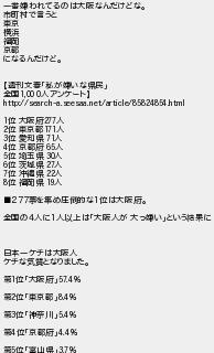 22: (愛知県) [] 2019/06/26(水) 17:05:24.98 ID:9YTb32ek 一番嫌われてるのは大阪なんだけどな。 市町村で言うと 東京 横浜 福岡 京都 になるんだけど。 【週刊文春「私が嫌いな県民」 全国1,00 0人アンケート】 http://search-a.seesaa.net/article/85824854.html 1位 大阪府277人 2位 東京都171人 3位 愛知県 71人 4位 京都府 65人 5位 埼玉県 30人 6位 茨城県 27人 7位 沖縄県 22人 8位 福岡県 19人 ■277票を集め圧倒的な1位は大阪府。 全国の4人に1人以上は「大阪人が 大っ嫌い」という結果に 日本一ケチは大阪人 ケチな気質となりました。 第1位「大阪府」57.4% 第2位「東京都」8.4% 第3位「神奈川」5.4% 第4位「京都府」4.4% 第5位「富山県」3.7% http://egg.5ch.io/test/read.cgi/develop/1482189013/22