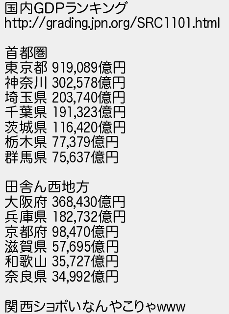 13: (やわらか銀行) [] 2017/02/19(日) 12:10:20.24 ID:hj54Zyn6 国内GDPランキング http://grading.jpn.org/SRC1101.html 首都圏 東京都 919,089億円 神奈川 302,578億円 埼玉県 203,740億円 千葉県 191,323億円 茨城県 116,420億円 栃木県 77,379億円 群馬県 75,637億円 田舎ん西地方 大阪府 368,430億円 兵庫県 182,732億円 京都府 98,470億円 滋賀県 57,695億円 和歌山 35,727億円 奈良県 34,992億円 関西ショボいなんやこりゃwww http://egg.5ch.net/test/read.cgi/develop/1487473301/13