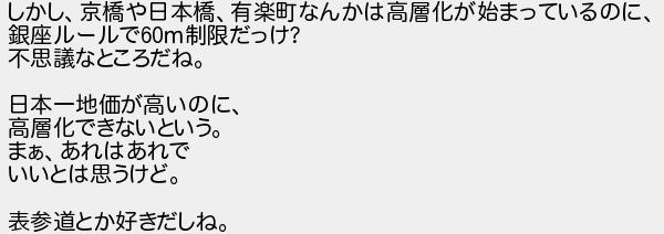 しかし京橋や日本橋有楽町なんかは高層化が始まっているのに 銀座ルールで制限だっけ 不思議なところだね 日本一地価が高いのに 高層化できないという まぁあれはあれで いいとは思うけど 表参道とか好きだしね