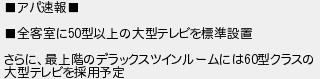 アパ速報 全客室に型以上の大型テレビを標準設置 さらに最上階のデラックスツインルームには型クラスの 大型テレビを採用予定