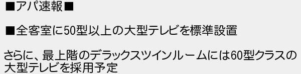 アパ速報 全客室に型以上の大型テレビを標準設置 さらに最上階のデラックスツインルームには型クラスの 大型テレビを採用予定