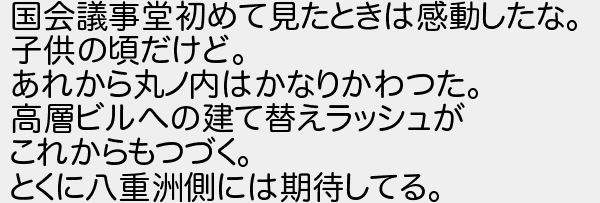 国会議事堂初めて見たときは感動したな 子供の頃だけど あれから丸ノ内はかなりかわつた 高層ビルへの建て替えラッシュが これからもつづく とくに八重洲側には期待してる