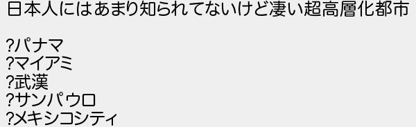 704: (関東・甲信越) [] 2017/05/01(月) 23:58:26.00 ID:0zrCGm0Z 日本人にはあまり知られてないけど凄い超高層化都市 ?パナマ ?マイアミ ?武漢 ?サンパウロ ?メキシコシティ http://egg.5ch.io/test/read.cgi/develop/1491221337/704