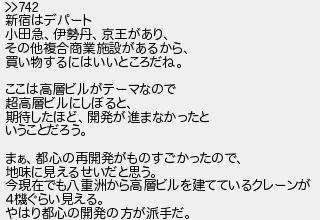 746: (地震なし) [] 2017/05/02(火) 23:05:29.80 ID:n+7J0MnR >>742 新宿はデパート 小田急、伊勢丹、京王があり、 その他複合商業施設があるから、 買い物するにはいいところだね。 ここは高層ビルがテーマなので 超高層ビルにしぼると、 期待したほど、開発が進まなかったと いうことだろう。 まぁ、都心の再開発がものすごかったので、 地味に見えるせいだと思う。 今現在でも八重洲から高層ビルを建てているクレーンが 4機ぐらい見える。 やはり都心の開発の方が派手だ。 http://egg.5ch.io/test/read.cgi/develop/1491221337/746