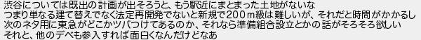 渋谷については既出の計画が出そろうともう駅近にまとまった土地がないな つまり単なる建て替えでなく法定再開発でないと新規で200級は難しいがそれだと時間がかかるし 次のネタ用に東急がどこかツバつけてあるのかそれなら準備組合設立とかの話がそろそろ欲しい それと他のデベも参入すれば面白くなんだけどなあ