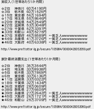 90: (芋) [] 2017/07/05(水) 19:35:23 ID:HKv4AMpS 実収入(1世帯あたり1か月間) ☆2位 神奈川 60万4190円 ☆3位 栃木県 60万1525円 ☆15位 東京都 56万1694円 ☆17位 埼玉県 55万8646円 ☆20位 茨城県 54万2549円 ★22位 滋賀県 53万3048円 ☆27位 千葉県 52万3397円 ★33位 和歌山 49万5275円 ★37位 京都府 46万8589円 ←貧乏人wwwwwwwwww ★44位 兵庫県 41万3726円 ←貧乏人wwwwwwwwww ★46位 大阪府 40万6338円 ←貧乏人wwwwwwwwww http://www.pref.tottori.lg.jp/secure/105984/00000420052059.pdf 家計最終消費支出(1世帯あたり1か月間) ☆2位 神奈川 35万3544円 ☆4位 埼玉県 33万8938円 ☆5位 栃木県 33万7869円 ☆6位 東京都 33万6136円 ★11位 滋賀県 33万0322円 ☆18位 千葉県 32万1434円 ★36位 京都府 28万0609円 ☆38位 群馬県 27万6605円 ★39位 兵庫県 27万2642円 ←貧乏人wwwwwwwwwwww ★45位 大阪府 26万1721円 ←貧乏人wwwwwwwwwwww ★46位 和歌山 25万3709円 ←貧乏人wwwwwwwwwwww http://www.pref.tottori.lg.jp/secure/105984/00000420052060.pdf http://egg.5ch.net/test/read.cgi/develop/1491672942/90
