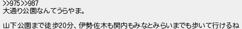 992: (茸) [sage] 2017/05/22(月) 23:03:57.35 ID:fqY8fJDq >>975>>987 大通り公園なんてうらやま。 山下公園まで徒歩20分、伊勢佐木も関内もみなとみらいまでも歩いて行けるね http://egg.5ch.io/test/read.cgi/develop/1494495787/992