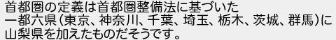 首都圏の定義は首都圏整備法に基づいた 一都六県東京神奈川千葉埼玉栃木茨城群馬に 山梨県を加えたものだそうです