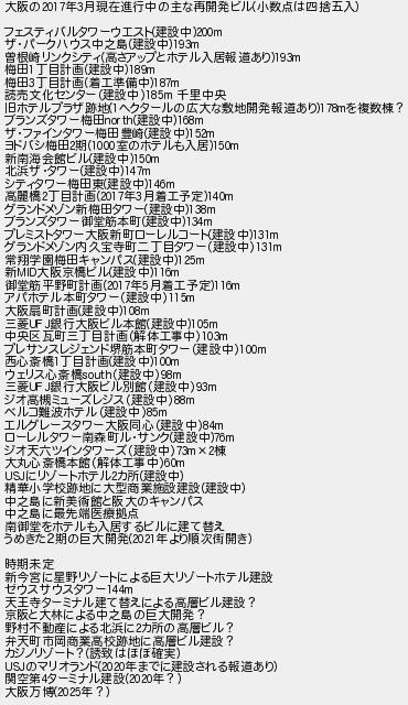 大阪の年月現在進行中の主な再開発ビル小数点は四捨五入 フェスティバルタワーウエスト建設中 ザパークハウス中之島建設中 曽根崎リンクシティ高さアップとホテル入居報道あり 梅田丁目計画建設中 梅田丁目計画着工準備中 読売文化センター建設中 千里中央 旧ホテルプラザ跡地ヘクタールの広大な敷地開発報道ありを複数棟? ブランズタワー梅田建設中 ザファインタワー梅田豊崎建設中 ヨドバシ梅田期室のホテルも入居 新南海会館ビル建設中 北浜ザタワー建設中 シティタワー梅田東建設中 高麗橋丁目計画年月着工予定 グランドメゾン新梅田タワー建設中 ブランズタワー御堂筋本町建設中 プレミストタワー大阪新町ローレルコート建設中 グランドメゾン内久宝寺町二丁目タワー建設中 常学園梅田キャンパス建設中 新大阪京橋ビル建設中 御堂筋平野町計画年月着工予定 アパホテル本町タワー建設中 大阪扇町計画建設中 三菱銀行大阪ビル本館建設中 中央区瓦町三丁目計画解体工事中 プレサンスレジェンド堺筋本町タワー建設中 西心斎橋丁目計画建設中 ウェリス心斎橋建設中 三菱銀行大阪ビル別館建設中 ジオ高槻ミューズレジス建設中 ベルコ難波ホテル建設中 エルグレースタワー大阪同心建設中 ローレルタワー南森町ルサンク建設中 ジオ天六ツインタワーズ建設中棟 大丸心斎橋本館解体工事中 にリゾートホテルカ所建設中 精華小学校跡地に大型商業施設建設建設中 中之島に新美術館と阪大のキャンパス 中之島に最先端医療拠点 南御堂をホテルも入居するビルに建て替え うめきた2期の巨大開発年より順次街開き 時期未定 新今宮に星野リゾートによる巨大リゾートホテル建設 ゼウスサウスタワー 天王寺ターミナル建て替えによる高層ビル建設? 京阪と大林による中之島の巨大開発? 野村不動産による北浜にカ所の高層ビル? 弁天町市岡商業高校跡地に高層ビル建設? カジノリゾート?誘致はほぼ確実 のマリオランド年までに建設される報道あり 関空第ターミナル建設年? 大阪万博年?
