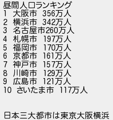 昼間人口ランキング 大阪市 万人 横浜市 万人 名古屋市万人 札幌市 万人 福岡市 万人 京都市 万人 神戸市 万人 川崎市 万人 広島市 万人 さいたま市 万人 日本三大都市は東京大阪横浜