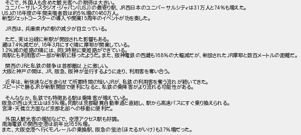 3: (catv?) [] 2017/08/16(水) 09:54:05.62 ID:dtKDSjHA そこで、外国人も含めた観光客への期待は大きい。 ユニバーサル・スタジオ・ジャパン(USJ)の最寄り駅、JR西日本のユニバーサルシティは3.1万人と7.4%も増えた。 USJの16年度の年間来場者数は約5%増の1460万人。 新型ジェットコースターの導入や開業15周年のイベントが功を奏した。 JR西は、兵庫県内の駅の減少が目立っている。 ただ、実は沿線に新駅が開設された影響もある。 灘は7.4%減だが、16年3月にすぐ隣に摩耶が開業している。 1.2%減の姫路の隣には、同じ時期に東姫路ができている。 両駅とも利用客の一部が新駅に移ったようだ。また、阪神電鉄の西灘も16.8%の大幅減だが、新設されたJR摩耶と数百メートルの距離だ。 関西のJRと私鉄の競争は首都圏以上に激しい。 大阪と神戸の間は、JR、阪急、阪神が並行するように走り、利用客を奪い合う。 近年は、新快速などを走らせて所要時間の短いJRが、私鉄の利用客を奪う流れが続いてきた。 スピードで勝るJRが新駅開設で便利になると、私鉄の乗降客がより流れる可能性がある。 そんななか、私鉄でも特徴ある駅は乗降客が増えている。 阪急の西山天王山は9.5%増。同駅は京都縦貫自動車道と直結し、駅から高速バスにすぐ乗り換えられる。 宮津・天橋立方面など京都北部への移動に便利だ。 外国人観光客の増加などで、空港アクセス駅も好調。 南海電鉄の関西空港は前年比16.5%増。 また、大阪空港へ行くモノレールの乗換駅、阪急の蛍池(ほたるがいけ)も3.7%増だった。 http://egg.5ch.net/test/read.cgi/develop/1502844620/3