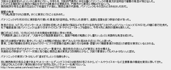 581: (やわらか銀行) [] 2018/02/06(火) 13:42:50.96 ID:dEKWLdaa 大阪は企業経営がしにくいから東京に行く−。今年5月、大阪府門真市に本社を置くパナソニックの事業方針説明会で衝撃の発言が飛び出した。 これから主軸を担う企業向け製品を手がける事業の主要拠点を、門真市から東京に移転させるという。 関西経済は有名企業の流出などで地盤沈下が進む。関西企業の代表格、パナソニックもその流れにさおをさした形だ。 衝撃の発言 「『門真』発想ではもう限界。すぐに東京に行くことを決めた」 パナソニックが5月30日に東京都内で開いた事業方針説明会。平然とした表情で、過激な言葉を放つ幹部の姿があった。 発言の主は、IoT(モノのインターネット)技術を活用した企業向け製品などを手がける社内分社「コネクティッドソリューションズ(CNS)社」の樋口泰行社長だ。 松下電器産業(現パナソニック)出身で日本マイクロソフトやダイエーのトップを歴任し、今年4月に異例の復帰を果たした。 樋口氏はこの日、10月にCNSの本社機能を東京都に移すと明言。 「門真限界」論にとどまらず、「大阪中心の製造事業部だと、意識や戦略の転換に少し重たい」などと刺激的な発言を続けた。 樋口氏は顧客が東京に集中していることを移転の理由に挙げ「みんなでお客さまの近くに行く」と語った。 事実、工場の稼働を効率化するIoTのサービスや旅客機の座席に備え付ける映像・音響(AV)機器事業の9割近くの顧客は東京にいるとされる。 またCNS社が手がけるサイバーセキュリティー事業では、競合他社のほとんどが東京に本社を構える。 同業他社の幹部は「サイバー対策に取り組む関西企業は東京より圧倒的に少なく、大阪で事業をしてもメリットはない」と話す。 パナソニックの東京シフトはむしろ「遅すぎた」という指摘も多い。 同じ関西発祥の有名企業であるサントリーホールディングス(HD)は昭和50年ごろから、ビールやウイスキーなど主要事業の機能を東京に移してきた。 大阪よりも人口の多い東京を選ぶのは「自然な流れ」(サントリー社員)だという。 http://www.sankei.com/west/news/170710/wst1707100007-n1.html http://egg.5ch.net/test/read.cgi/develop/1502844620/581