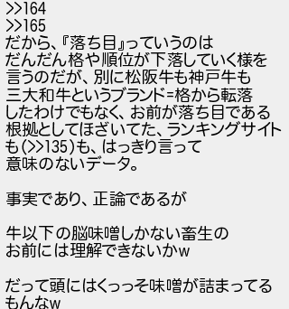 だから落ち目っていうのは だんだん格や順位が下落していく様を 言うのだが別に松阪牛も神戸牛も 三大和牛というブランド格から転落 したわけでもなくお前が落ち目である 根拠としてほざいてたランキングサイト ももはっきり言って 意味のないデータ 事実であり正論であるが 牛以下の脳味噌しかない畜生の お前には理解できないか だって頭にはくっっそ味噌が詰まってる もんな