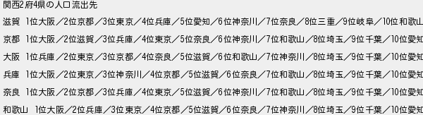 関西府県の人口流出先 滋賀 位大阪位京都位東京位兵庫位愛知位神奈川位奈良位三重位岐阜位和歌山 京都 位大阪位滋賀位兵庫位東京位奈良位神奈川位和歌山位埼玉位千葉位愛知 大阪 位兵庫位東京位京都位奈良位滋賀位和歌山位神奈川位埼玉位千葉位愛知 兵庫 位大阪位東京位神奈川位京都位滋賀位奈良位和歌山位埼玉位千葉位愛知 奈良 位大阪位京都位兵庫位東京位滋賀位神奈川位和歌山位埼玉位千葉位愛知 和歌山 位大阪位兵庫位東京位京都位滋賀位奈良位神奈川位埼玉位千葉位愛知