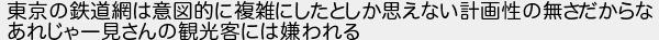 東京の鉄道網は意図的に複雑にしたとしか思えない計画性の無さだからな あれじゃ一見さんの観光客には嫌われる