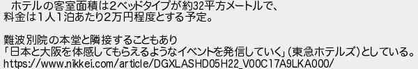 866: (大阪府) [sage] 2017/09/07(木) 22:25:45.83 ID:jHBXn3zN ホテルの客室面積は2ベッドタイプが約32平方メートルで、 料金は1人1泊あたり2万円程度とする予定。 難波別院の本堂と隣接することもあり 「日本と大阪を体感してもらえるようなイベントを発信していく」(東急ホテルズ)としている。 https://www.nikkei.com/article/DGXLASHD05H22_V00C17A9LKA000/ http://egg.5ch.net/test/read.cgi/develop/1503124183/866