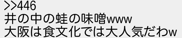 449: (茸) [] 2017/08/31(木) 21:38:07.17 ID:vjA70cb0 >>446 井の中の蛙の味噌www 大阪は食文化では大人気だわw http://egg.5ch.net/test/read.cgi/develop/1503387033/449