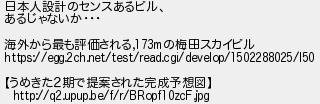 550: (やわらか銀行) [] 2017/09/09(土) 23:03:57.09 ID:htDmEncT 日本人設計のセンスあるビル、 あるじゃないか・・・ 海外から最も評価される,173mの梅田スカイビル https://egg.2ch.net/test/read.cgi/develop/1502288025/l50 【うめきた2期で提案された完成予想図】 http://q2.upup.be/f/r/BRopf10zcF.jpg http://egg.5ch.net/test/read.cgi/develop/1504101366/550