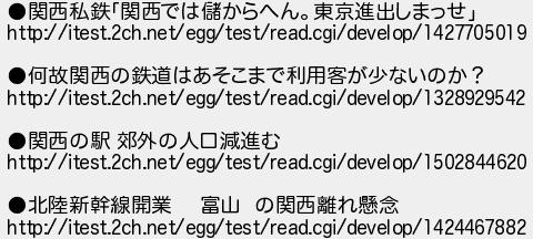 6: (やわらか銀行) [sage] 2017/09/07(木) 10:14:21.01 ID:H9O5YT5S ●関西私鉄「関西では儲からへん。東京進出しまっせ」 http://itest.2ch.net/egg/test/read.cgi/develop/1427705019 ●何故関西の鉄道はあそこまで利用客が少ないのか? http://itest.2ch.net/egg/test/read.cgi/develop/1328929542 ●関西の駅 郊外の人口減進む http://itest.2ch.net/egg/test/read.cgi/develop/1502844620 ●北陸新幹線開業 富山 の関西離れ懸念 http://itest.2ch.net/egg/test/read.cgi/develop/1424467882 http://egg.5ch.net/test/read.cgi/develop/1504708745/6