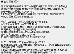 秋に世界3位へ 年に2回発表されるスパコンの計算速度の世界ランクで今年6月 海洋研究開発機構横浜研究所の暁光が69位に初登場した まだ一部しか稼働していないが 11月までにフル稼働すれば国内トップの東大筑波大を抜き 一気に世界3位となる見通しだ ペジーコンピューティング東京を中核とする ベンチャー企業グループが開発した 1つの演算処理装置に千個以上の回路を搭載して効率を高め 超高密度の半導体メモリーを採用 装置の冷却は従来のファンによる排熱ではなく 液体に丸ごと浸して強力に冷やす 日本の独自技術を詰め込んだ特注マシンだ 世界トップの座は日米中が激しく争ってきた 日本は2002年に海洋機構の地球シミュレータが首位となったが その後は米国が逆転 11年には理化学研究所の京けいが首位を奪還したものの 現在は8位に後退し中国が9連覇中で独走している