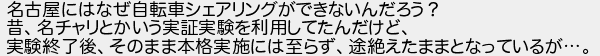 名古屋にはなぜ自転車シェアリングができないんだろう? 昔名チャリとかいう実証実験を利用してたんだけど 実験終了後そのまま本格実施には至らず途絶えたままとなっているが