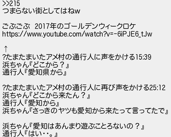 216: (大阪府) [sage] 2017/11/04(土) 11:23:57.92 ID:1Qq0SKoY >>215 つまらない街としてはねw ごぶごぶ 2017年のゴールデンウィークロケ https://www.youtube.com/watch?v=-6iPJE6_tJw ↑ ?たまたまいたアメ村の通行人に声をかける15:39 浜ちゃん『どこから?』 通行人『愛知県から』 ?たまたまいたアメ村の通行人に再び声をかける25:12 浜ちゃん『どこから来たん?』 通行人『愛知から』 浜ちゃん『さっきのヤツも愛知から来たって言ってたで』 浜ちゃん『愛知はあんまり遊ぶことろないの?』 通行人『はい・・。』 http://egg.5ch.net/test/read.cgi/develop/1509401741/216