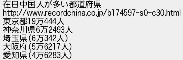 351: (大阪府) [sage] 2017/11/07(火) 00:06:00.38 ID:JJV69QW/ 在日中国人が多い都道府県 http://www.recordchina.co.jp/b174597-s0-c30.html 東京都19万444人 神奈川県6万2493人 埼玉県(6万342人) 大阪府(5万6217人) 愛知県(4万6283人) http://egg.5ch.net/test/read.cgi/develop/1509401741/351
