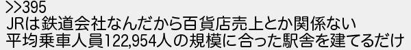 397: (SB-iPhone) [] 2018/02/23(金) 08:55:25 ID:qy34Gxyw >>395 JRは鉄道会社なんだから百貨店売上とか関係ない 平均乗車人員122,954人の規模に合った駅舎を建てるだけ http://egg.5ch.net/test/read.cgi/develop/1509586475/397