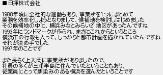 日揮株式会社 年頃に全社的な運動もあり事業所をつにまとめて 業務を効率化しようとなりまして候補地を検討しはじめました その候補地の中に横浜みなとみらい地区があったんですね 年にランドマークが作られまさにこれからというところ 横浜市の行政も入ってしっかりと都市計画を描かれていたんですね それが決め手でした 年のことです また長らく上大岡に事業所がありましたので 社員の多くが三浦半島に住んでいたということもあり 従業員にとって馴染みのある横浜を選んだということです