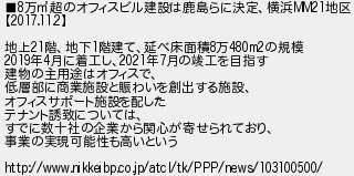万超のオフィスビル建設は鹿島らに決定横浜地区 地上階地下階建て延べ床面積万の規模 年月に着工し年月の竣工を目指す 建物の主用途はオフィスで 低層部に商業施設と賑わいを創出する施設 オフィスサポート施設を配した テナント誘致については すでに数十社の企業から関心が寄せられており 事業の実現可能性も高いという