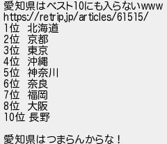 709: (pc?) [sage] 2017/12/02(土) 13:09:06.74 ID:u1RXi/CE 愛知県はベスト10にも入らないwww https://retrip.jp/articles/61515/ 1位 北海道 2位 京都 3位 東京 4位 沖縄 5位 神奈川 6位 奈良 7位 福岡 8位 大阪 10位 長野 愛知県はつまらんからな! http://egg.5ch.io/test/read.cgi/develop/1510299949/709