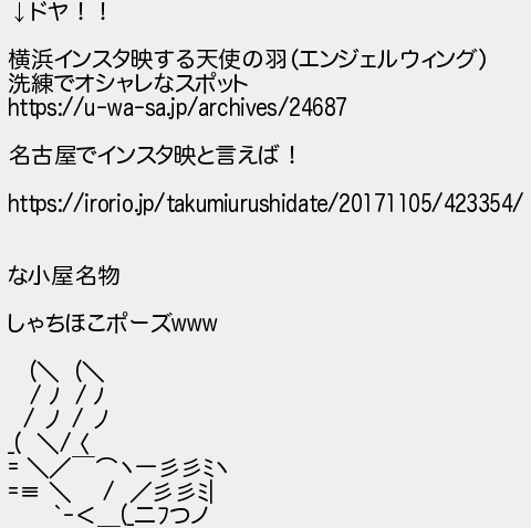 722: (pc?) [sage] 2017/12/02(土) 13:17:36.84 ID:u1RXi/CE ↓ドヤ!! 横浜インスタ映する天使の羽(エンジェルウィング) 洗練でオシャレなスポット https://u-wa-sa.jp/archives/24687 名古屋でインスタ映と言えば! https://irorio.jp/takumiurushidate/20171105/423354/ な小屋名物 しゃちほこポーズwww (\ (\ / ノ / ノ / 丿 / 丿 _( \/ 〈 = \/ ̄⌒ヽ―彡彡ミヽ =≡ \ / /彡彡ミ| `-<_(_二フつノ http://egg.5ch.io/test/read.cgi/develop/1510299949/722