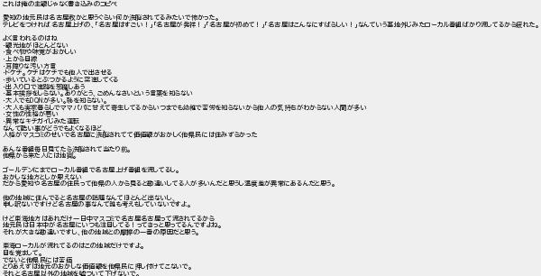 これは俺の主観じゃなく書き込みのコピペ 愛知の地元民は名古屋教かと思うぐらい何か洗脳されてるみたいで怖かった テレビをつければ名古屋上げの名古屋はすごい!名古屋が発祥!名古屋が初めて!名古屋はこんなにすばらしい!なんていう基地外じみたローカル番組ばかり流してるから疲れた よく言われるのはね 観光地がほとんどない 食べ物や味覚がおかしい 上から目線 耳障りな汚い方言 ドケチケチはケチでも他人で出させる 歩いているとぶつかるように突進してくる 出入り口で進路を邪魔しあう 基本挨拶をしらないありがとうごめんなさいという言葉を知らない 大人でもが多い恥を知らない 大人も実家暮らしでママパパに甘えて寄生してるからいつまでも幼稚で苦労を知らないから他人の気持ちがわからない人間が多い 女性の性格が悪い 異常なキチガイじみた運転 なんて酷い事がどうでもよくなるほど 人格がマスコミのせいで名古屋に洗脳されてて価値観がおかしく他県民には住みずらかった あんな番組毎日見てたら洗脳されて当たり前 他県から来た人には地獄 ゴールデンにまでローカル番組で名古屋上げ番組を流してるし おかしな地方としか思えない だから愛知や名古屋の住民って他県の人から見ると勘違いしてる人が多いんだと思うし温度差が異常にあるんだと思う 他の地域に住んでると名古屋の話題なんてほとんど出ないし 申し訳ないですけど名古屋の事なんて誰も考えもしていないですよ けど東海地方はあれだけ一日中マスコミで名古屋名古屋って流されてるから 地元民は日本中が名古屋にいつも注目してる!ってきっと思ってるんですよね それが大きな勘違いですし他の地域との摩擦の一番の原因だと思う 東海ローカルが流れてるのはこの地域だけですよ 目を覚まして でないと他県民には苦痛 とりあえずは地元のおかしな価値観を他県民に押し付けてこないで それと名古屋以外の地域を嘘ついて下げないで