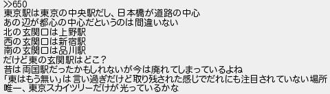 653: (空) [] 2021/10/04(月) 08:32:46 ID:LlfFPDgV >>650 東京駅は東京の中央駅だし、日本橋が道路の中心 あの辺が都心の中心だというのは間違いない 北の玄関口は上野駅 西の玄関口は新宿駅 南の玄関口は品川駅 だけど東の玄関駅はどこ? 昔は両国駅だったかもしれないが今は廃れてしまっているよね 「東はもう無い」は言い過ぎだけど取り残された感じでだれにも注目されていない場所 唯一、東京スカイツリーだけが光っているかな http://egg.5ch.net/test/read.cgi/develop/1512216157/653