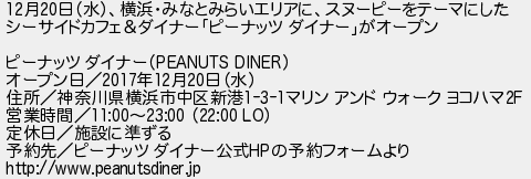 月日水横浜みなとみらいエリアにスヌーピーをテーマにした シーサイドカフェダイナーピーナッツ ダイナーがオープン ピーナッツ ダイナー オープン日年月日水 住所神奈川県横浜市中区新港マリン アンド ウォーク ヨコハマ 営業時間 定休日施設に準ずる 予約先ピーナッツ ダイナー公式の予約フォームより