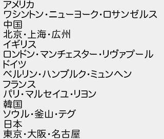 アメリカ ワシントンニューヨークロサンゼルス 中国 北京上海広州 イギリス ロンドンマンチェスターリヴァプール ドイツ ベルリンハンブルクミュンへン フランス パリマルセイユリヨン 韓国 ソウル釜山テグ 日本 東京大阪名古屋