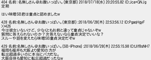 名前名無しさんお腹いっぱい東京都 水 定期 はい味噌君は童貞と認めました 名前名無しさんお腹いっぱい東京都 木 今は彼女いないけど少なくともお前と違って童貞じゃないぞ 質問に答えられないのか?次答えないなら童貞決定でいいな? スルーや話を変えたら味噌童貞決定だぞ 名前名無しさんお腹いっぱい 木 福岡も福井も大阪より愛知の方が 転出超過多いのに本当にバカだな 大阪自体も愛知に転出超過だったな