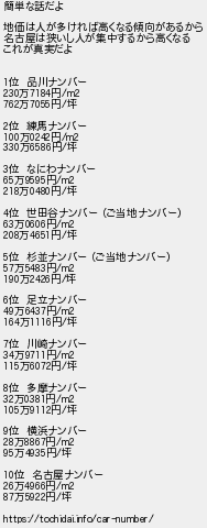 簡単な話だよ 地価は人が多ければ高くなる傾向があるから 名古屋は狭いし人が集中するから高くなる これが真実だよ 位 品川ナンバー 万円 万円坪 位 練馬ナンバー 万円 万円坪 位 なにわナンバー 万円 万円坪 位 世田谷ナンバー ご当地ナンバー 万円 万円坪 位 杉並ナンバー ご当地ナンバー 万円 万円坪 位 足立ナンバー 万円 万円坪 位 川崎ナンバー 万円 万円坪 位 多摩ナンバー 万円 万円坪 位 横浜ナンバー 万円 万円坪 位 名古屋ナンバー 万円 万円坪