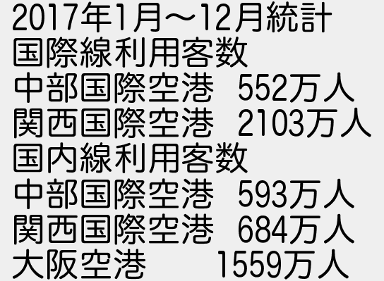 2: (大阪府) [sage] 2018/09/21(金) 00:31:07 ID:crCgXbCS 2017年1月〜12月統計 国際線利用客数 中部国際空港 552万人 関西国際空港 2103万人 国内線利用客数 中部国際空港 593万人 関西国際空港 684万人 大阪空港 1559万人 http://egg.5ch.net/test/read.cgi/develop/1537457450/2