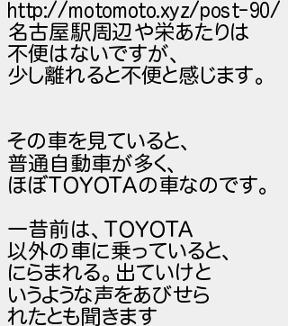 653: (チベット自治区) [] 2018/11/08(木) 08:22:23.13 ID:rnLeT3Xm http://motomoto.xyz/post-90/ 名古屋駅周辺や栄あたりは 不便はないですが、 少し離れると不便と感じます。 その車を見ていると、 普通自動車が多く、 ほぼTOYOTAの車なのです。 一昔前は、TOYOTA 以外の車に乗っていると、 にらまれる。出ていけと いうような声をあびせら れたとも聞きます http://egg.5ch.net/test/read.cgi/develop/1540695693/653