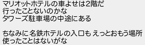 マリオットホテルの車よせは2階だ 行ったことないのかな タワーズ駐車場の中途にある ちなみに名鉄ホテルの入口も えっとおもう場所 使ったことはないがな