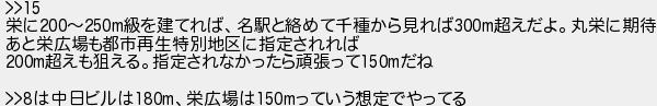 18: (庭) [] 2018/11/02(金) 02:57:02.95 ID:avdsKsLL >>15 栄に200〜250m級を建てれば、名駅と絡めて千種から見れば300m超えだよ。丸栄に期待 あと栄広場も都市再生特別地区に指定されれば 200m超えも狙える。指定されなかったら頑張って150mだね >>8は中日ビルは180m、栄広場は150mっていう想定でやってる http://egg.5ch.net/test/read.cgi/develop/1540959778/18