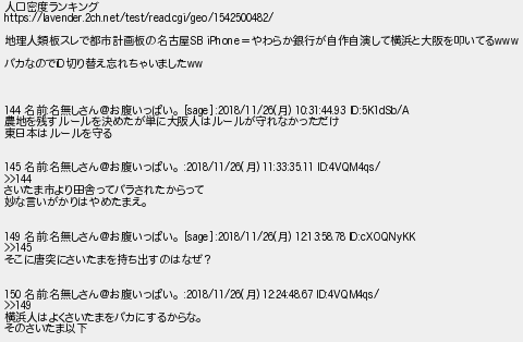 597: (SB-iPhone) [] 2018/11/26(月) 12:40:13.93 ID:JB+LsOMO 人口密度ランキング https://lavender.2ch.net/test/read.cgi/geo/1542500482/ 地理人類板スレで都市計画板の名古屋SB iPhone=やわらか銀行が自作自演して横浜と大阪を叩いてるwww バカなのでiD切り替え忘れちゃいましたww 144 名前:名無しさん@お腹いっぱい。 [sage] :2018/11/26(月) 10:31:44.93 ID:5K1dSb/A 農地を残すルールを決めたが単に大阪人はルールが守れなかっただけ 東日本はルールを守る 145 名前:名無しさん@お腹いっぱい。 :2018/11/26(月) 11:33:35.11 ID:4VQM4qs/ >>144 さいたま市より田舎ってバラされたからって 妙な言いがかりはやめたまえ。 149 名前:名無しさん@お腹いっぱい。 [sage] :2018/11/26(月) 12:13:58.78 ID:cXOQNyKK >>145 そこに唐突にさいたまを持ち出すのはなぜ? 150 名前:名無しさん@お腹いっぱい。 :2018/11/26(月) 12:24:48.67 ID:4VQM4qs/ >>149 横浜人はよくさいたまをバカにするからな。 そのさいたま以下 http://egg.5ch.net/test/read.cgi/develop/1540959778/597